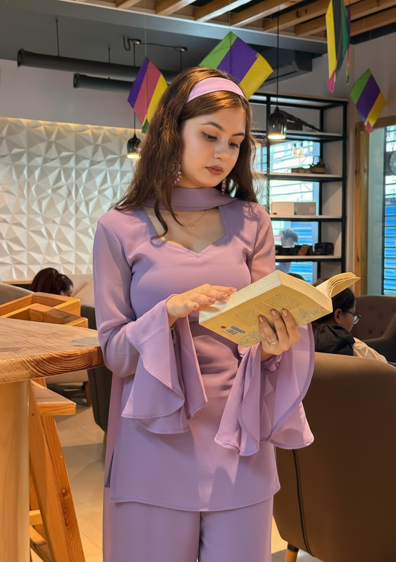 ✔ Complete 4-Piece Set: Includes the Bell Sleeve Top, Wide-Leg Pants, Matching Neck Scarf,and a Matching Hair Band.