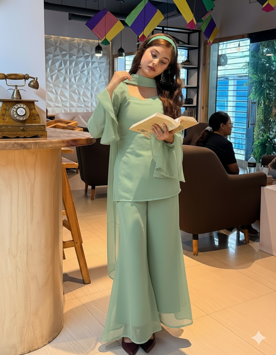 Bollywood Vintage Georgette Co-ord Set with Scarf & Hair Band | 4 Colors