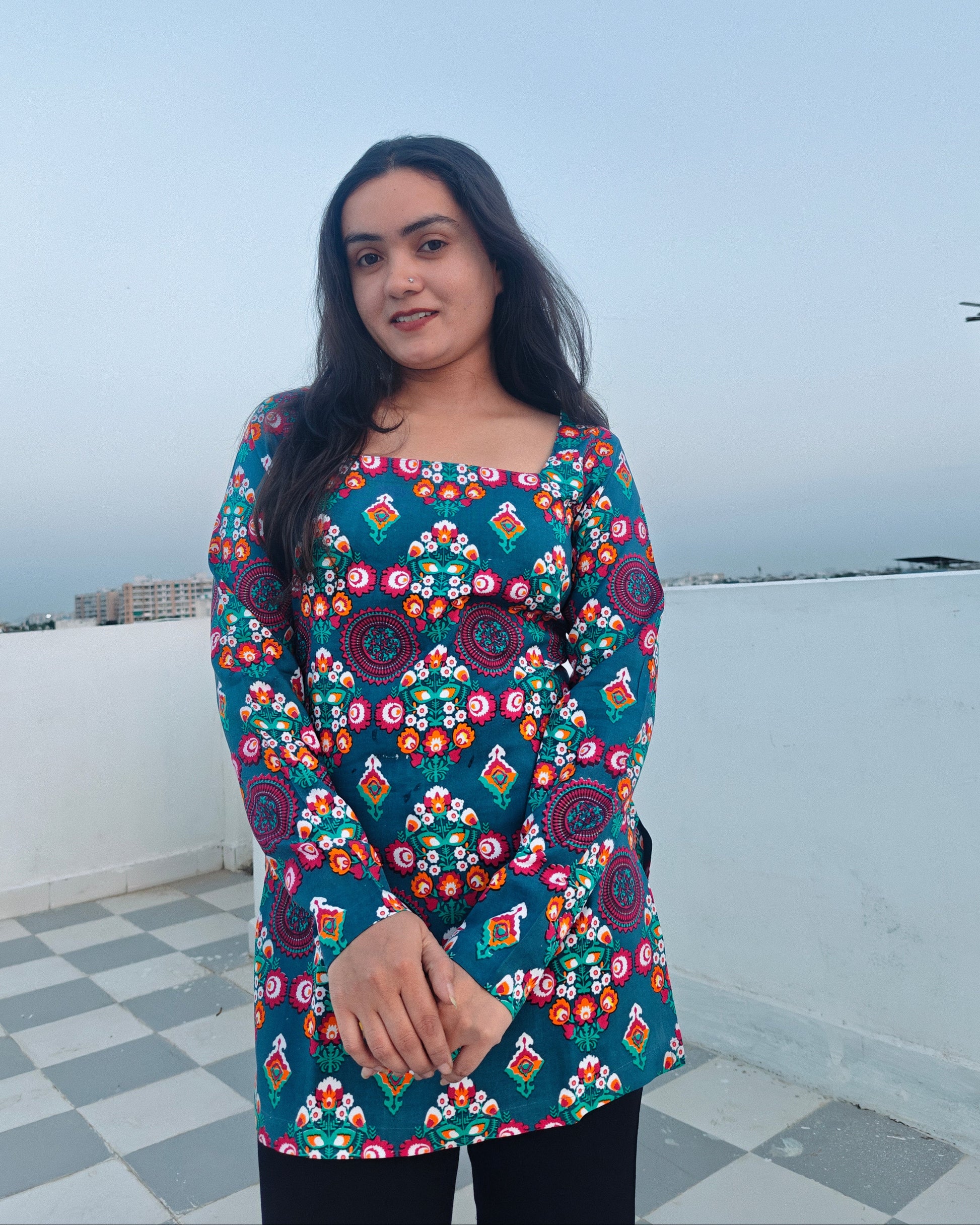 Sea Mirage Cotton Kurti – Floral Printed Straight Fit with Square Neck