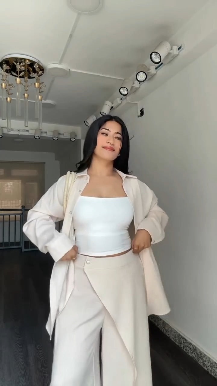 ✔ Solid Top + Wrap-Style Slit Palazzo – Modern, minimal, and flowy.
